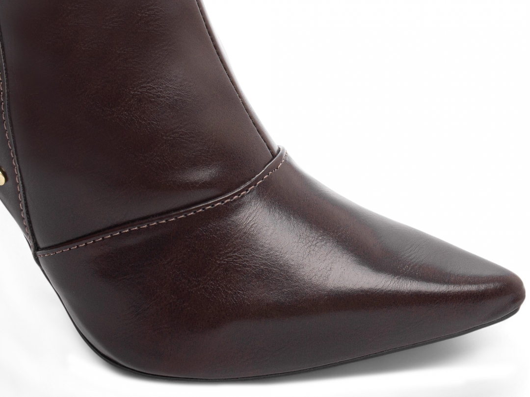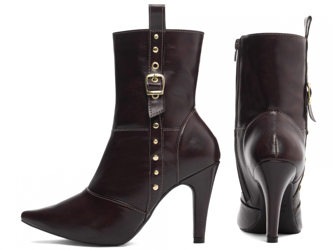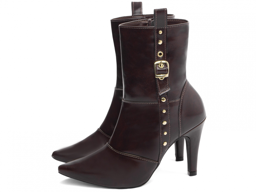 Material: Napa Marrom Café; Enfeites: Zíper na Cor Marrom Café, Fivelas e Apliques na Cor Dourado; Palmilha: 8 mm de Espessura, Espuma em EVA, e Taloneira Napa Preto; Forro: Cacharrel, material espumado para maior conforto, na cor Marrom Café; Salto: 9 cm de Altura e Revestido em Napa na cor Marrom Café; Solado de TR na cor Preto.