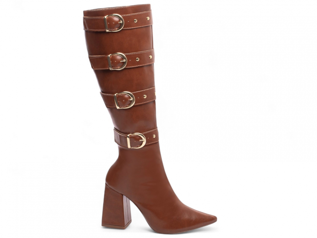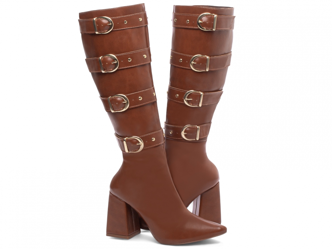 Material: Napa Caramelo; Enfeites: Zíper na Cor Caramelo, Fivelas e Apliques na Cor Dourado; Palmilha: 8 mm de Espessura, Espuma em EVA, e Taloneira Napa Preto; Forro: Cacharrel, material espumado para maior conforto, na cor Marrom Café; Salto: 9 cm de Altura e Revestido em Napa na cor Caramelo; Solado de TR na cor Bege.