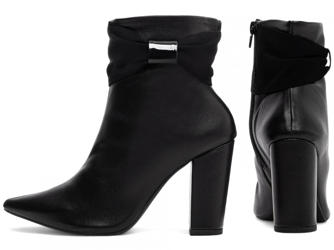 Material: Napa Preto / Nobuck Preto; Enfeites: Zíper na Cor Preto e Tiras em Laço na cor Nobuck Preto / Verniz Preto; Palmilha: 8 mm de Espessura, Espuma em EVA, e Taloneira Napa Preto; Forro: Cacharrel, material espumado para maior conforto, na cor Preto; Salto: 9 cm de Altura e Revestido em Napa na cor Preto; Solado de TR na cor Preto.