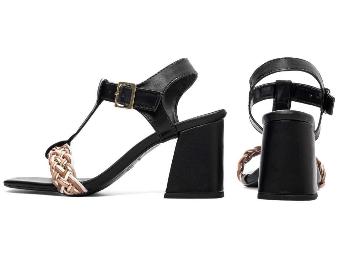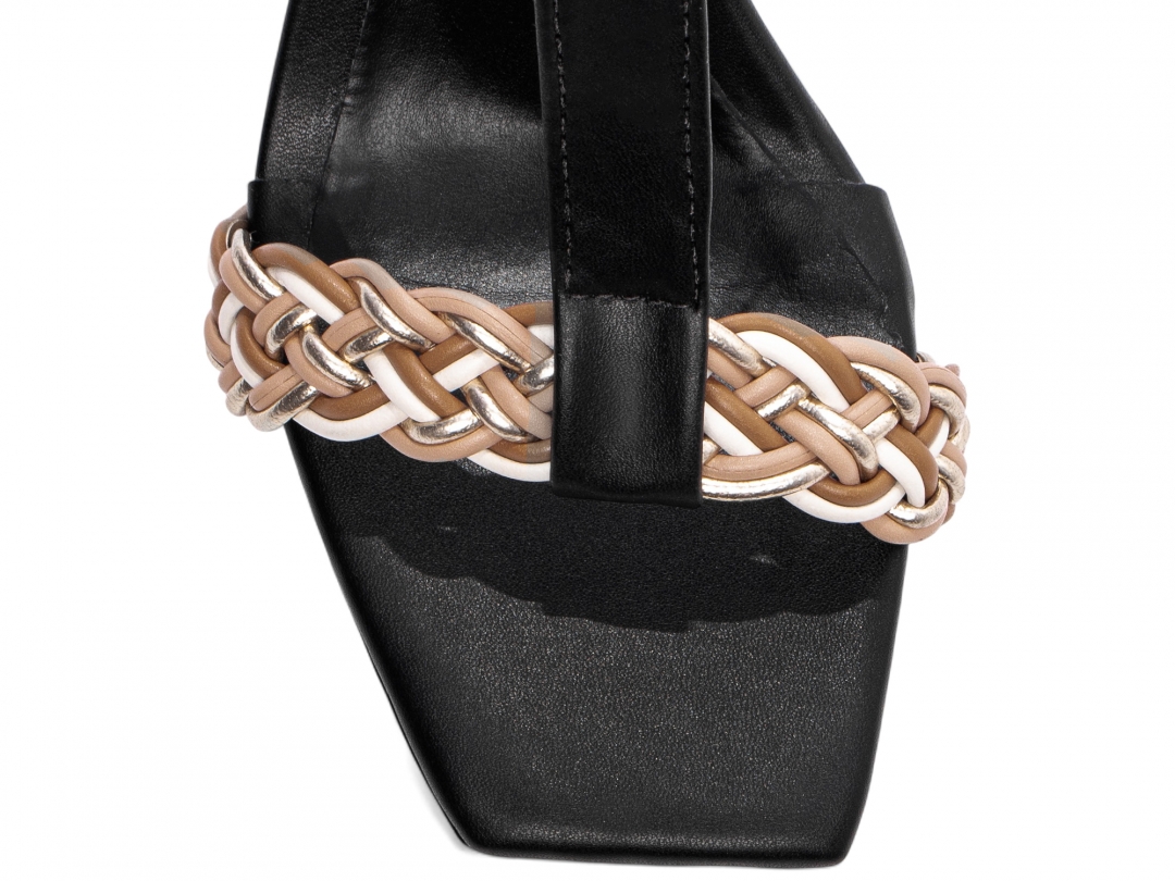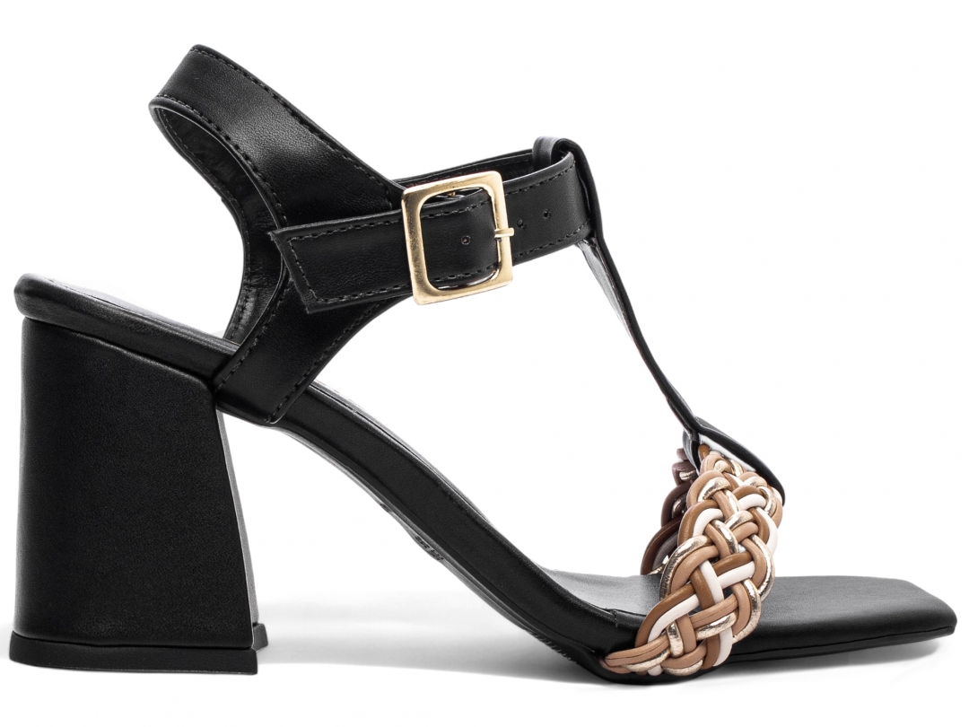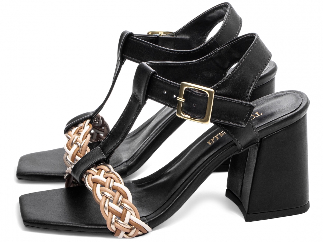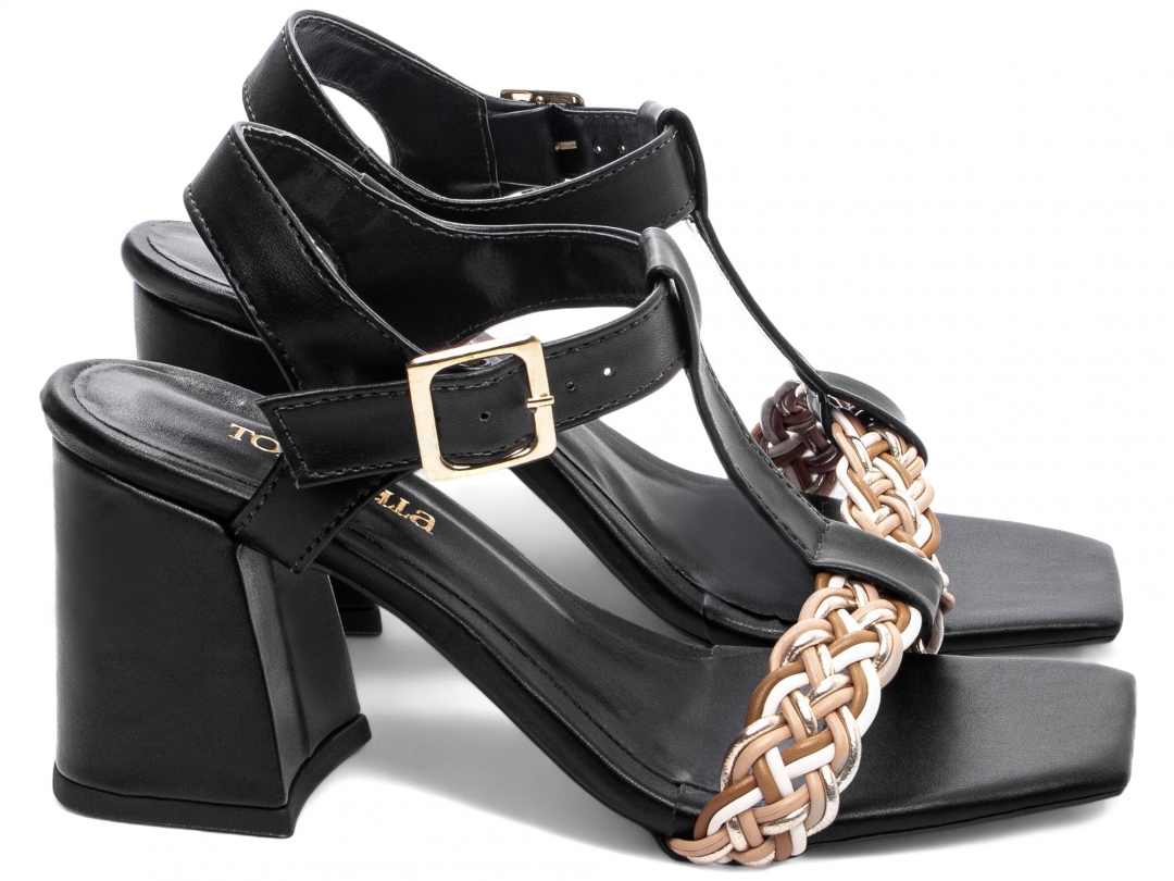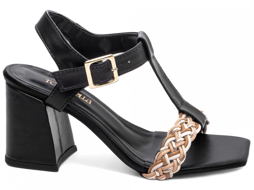 Material: Napa Preto e Trança Multicolorida; Enfeite: Fivela de Ajuste na cor Dourado; Palmilha: 8 mm de Espessura, Espuma em EVA, Revestida em Napa Preto e Taloneira Napa Preto; Salto: Grosso com 7 cm de Altura Revestido em Napa Preto; Solado de PVC com antiderrapante na cor Preto.
