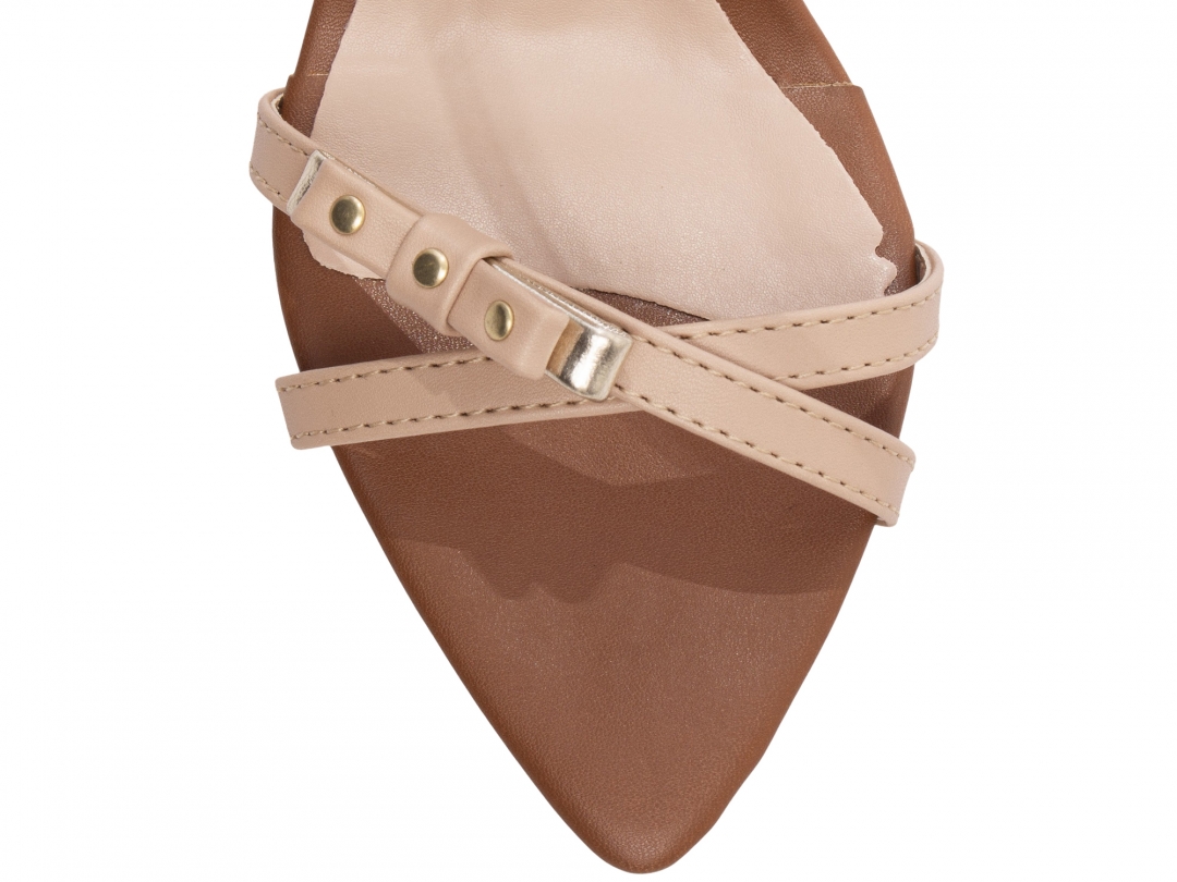 Material: Napa Bege e Napa Caramelo; Palmilha: 8 mm de Espessura, Espuma em EVA, Revestida em Napa Caramelo e Taloneira Napa Bege; Enfeite: Laço com Apliques em metal na cor Dourado e Fivela de Ajuste na cor Dourado; Salto: Fino com 9 cm de Altura Pintado na cor Caramelo; Solado de PVC com antiderrapante na cor Bege.