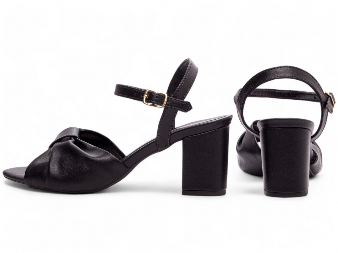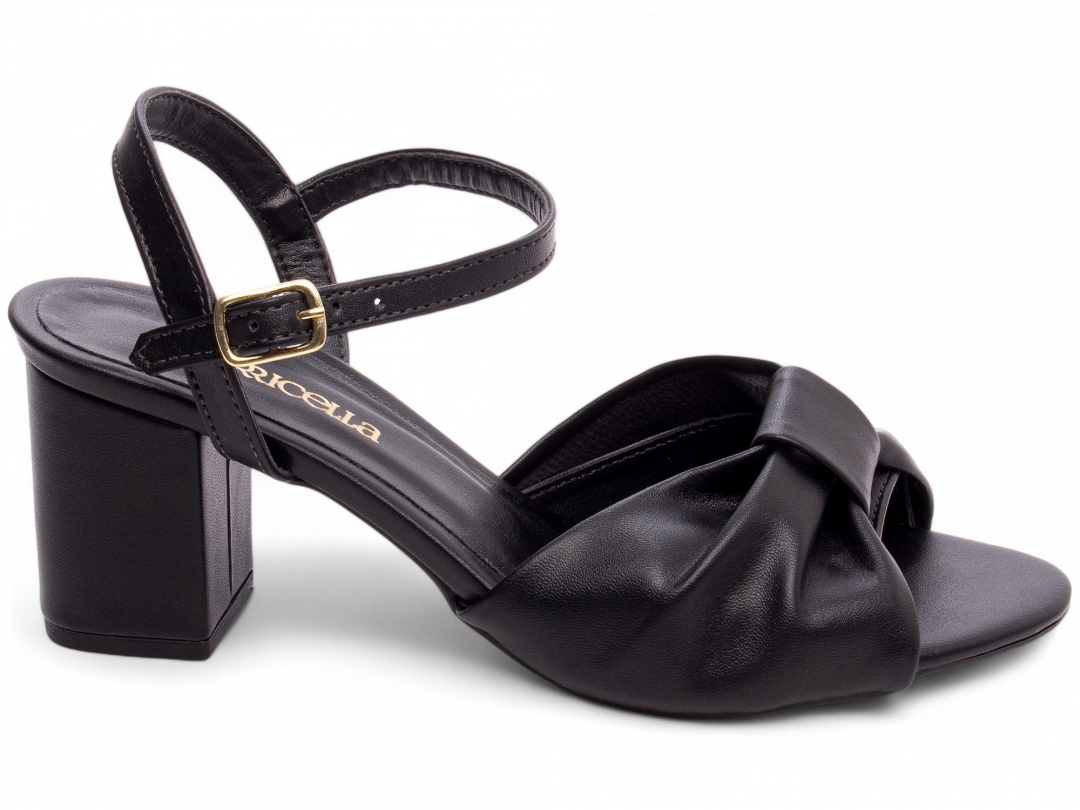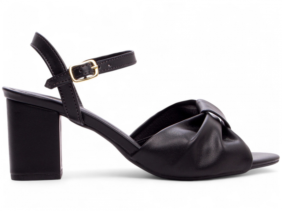 Material: Napa Preto; Enfeite: Fivela de ajuste na cor Dourado; Forro: Napa na cor Preto; Palmilha: 8 mm de Espessura, Espuma em EVA, Revestida em Napa Preto e Taloneira Napa Preto; Salto: Grosso com 6 cm de Altura Revestido em Napa Preto; Solado de PVC com antiderrapante na cor Preto.
