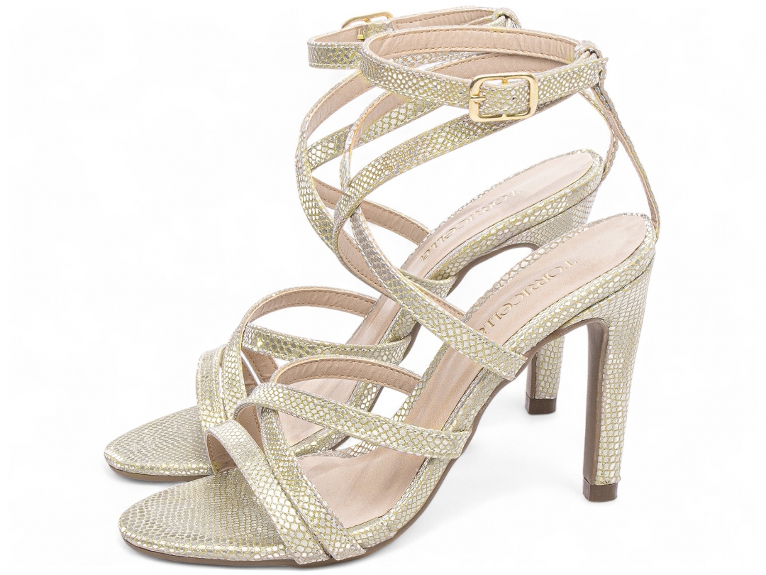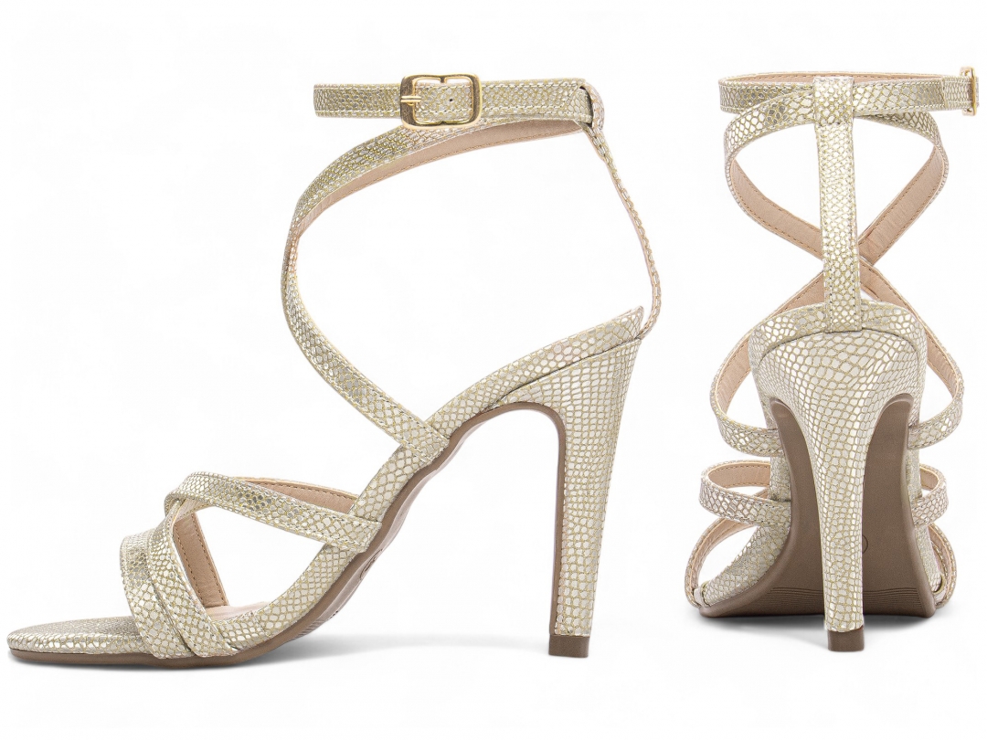 Material: Croco Metalizado Ouro Light; Palmilha: 8 mm de Espessura, Espuma em EVA, Revestida em Croco Metalizado Ouro Light e Taloneira Napa Bege; Enfeite: Fivela de Ajuste na Cor Dourado; Salto: Fino com 9,5 cm de Altura Croco Metalizado Ouro Light; Solado de TR na cor Bege.