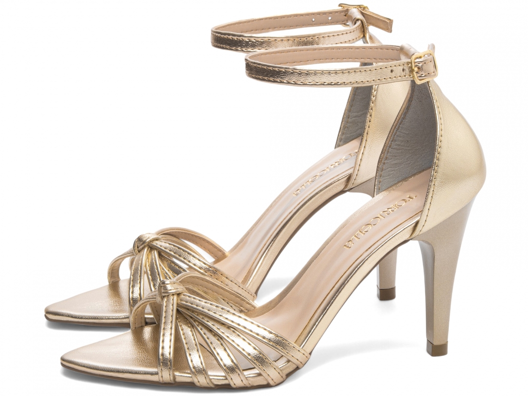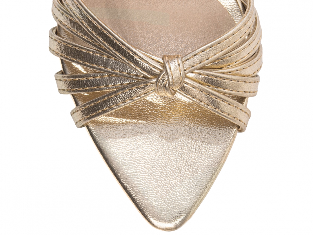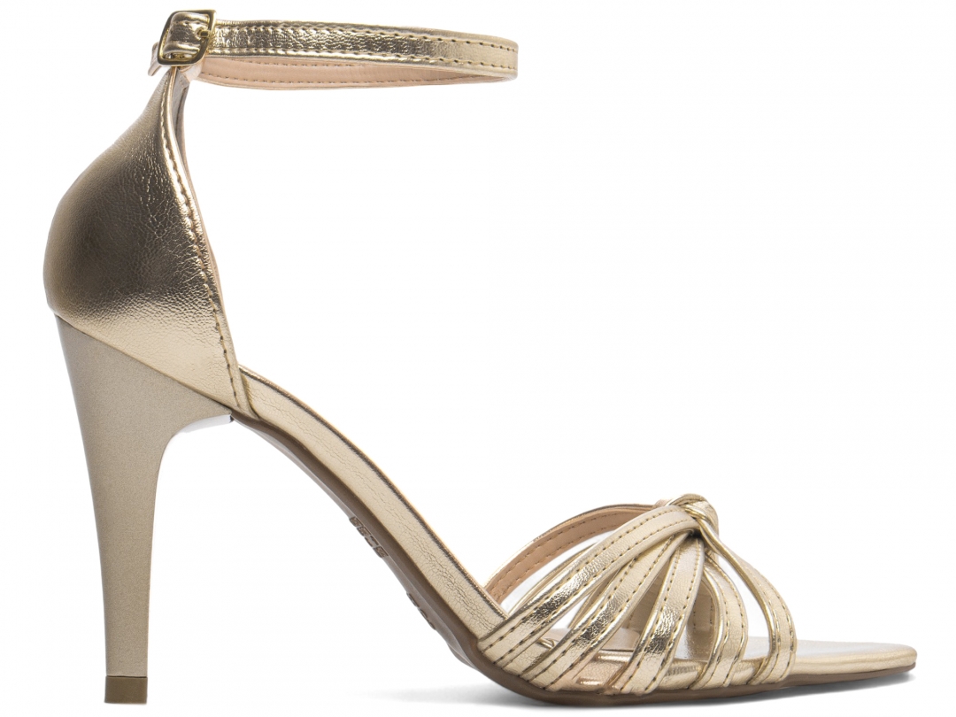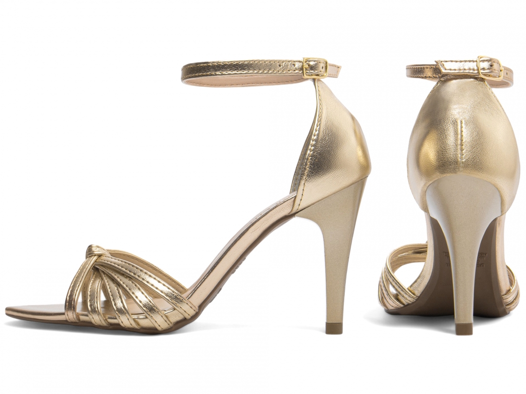 Material: Napa Metalizado Ouro Light; Palmilha: 8 mm de Espessura, Espuma em EVA, Revestida em Napa Metalizado Ouro Light e Taloneira Napa Bege; Enfeite: Fivela de Ajuste na cor Dourado; Salto: Fino com 9 cm de Altura Pintado na cor Dourado; Solado de PVC com antiderrapante na cor Bege.