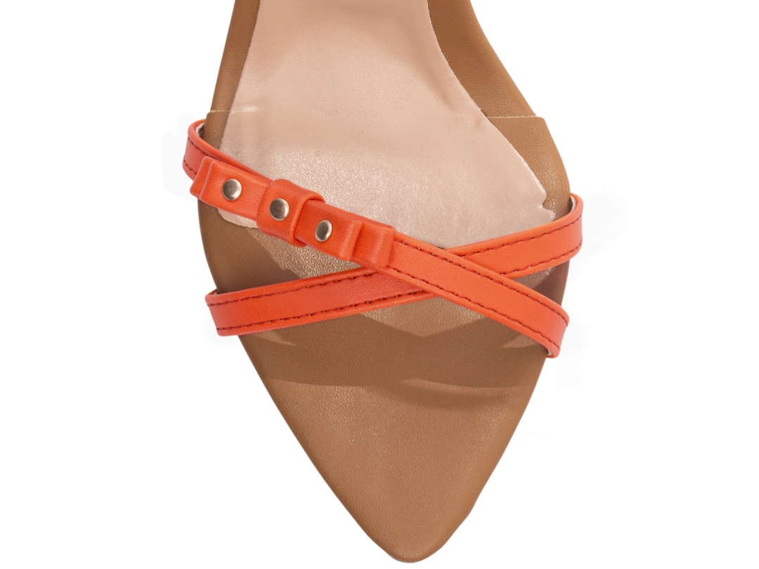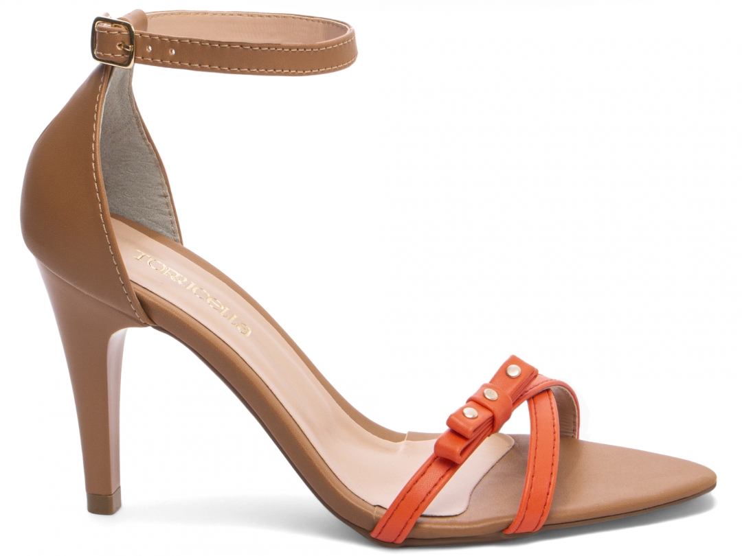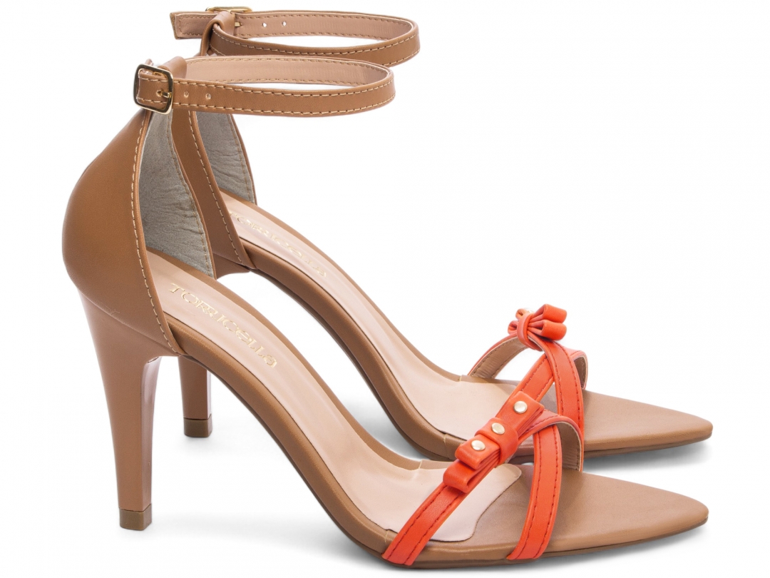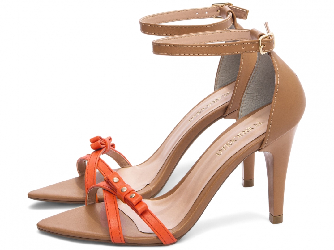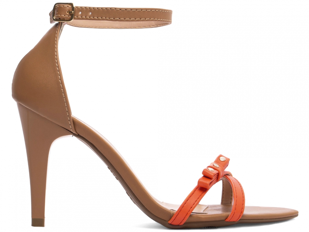 Material: Napa Laranja e Napa Bege; Palmilha: 8 mm de Espessura, Espuma em EVA, Revestida em Napa Bege e Taloneira Napa Bege; Enfeite: Laço com Apliques em metal na cor Dourado e Fivela de Ajuste na cor Dourado; Salto: Fino com 9 cm de Altura Pintado na cor Bege; Solado de PVC com antiderrapante na cor Bege.