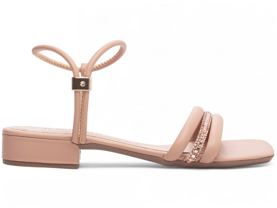 Material: Napa Rose / Manta de Strass na cor Rose; Enfeite: Peça em ABS para ajuste no Cor Dourado; Forro: Napa na cor Bege; Palmilha: 8 mm de Espessura, Espuma em EVA, Revestida em Napa Rose e Taloneira Napa Bege; Salto: Baixo com 2,5 cm de Altura Revestido em Napa Rose; Solado de PVC com antiderrapante na cor Bege.