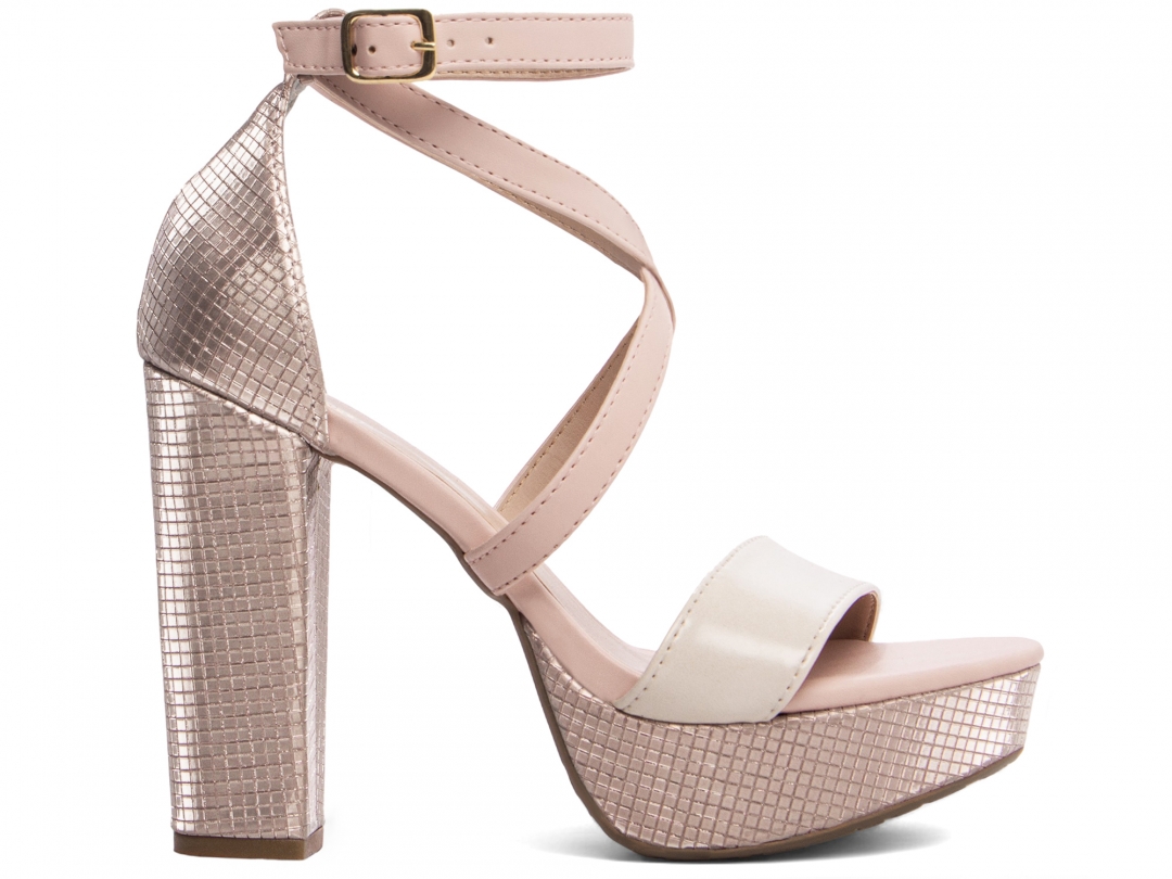 Material: Napa Off White, Napa Rosa e Croco Metalizado Rosa; Enfeites: Fivela de Ajuste na cor Dourado; Palmilha: 8 mm de Espessura, Espuma em EVA, Revestida em Napa Rosa e Taloneira Napa Bege; Meia Pata: Revestida em Croco Metalizado Rosa com 3,5 cm de altura; Salto: Bloco com 11 cm de Altura Revestido em Croco Metalizado Rosa; Solado de TR com antiderrapante na cor Bege.