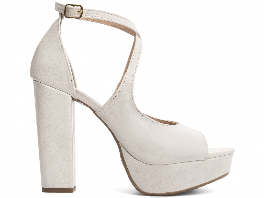 Material: Napa Off White; Enfeites: Fivela de Ajuste na cor Dourado; Palmilha: 8 mm de Espessura, Espuma em EVA, Revestida em Napa Off White e Taloneira Napa Bege; Meia Pata: Revestida em Napa Off White com 3,5 cm de altura; Salto: Bloco com 11 cm de Altura Revestido em Napa Off White; Solado de TR com antiderrapante na cor Bege.