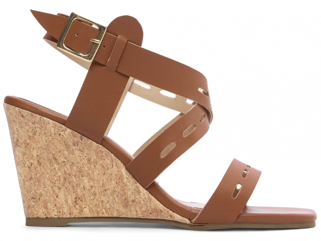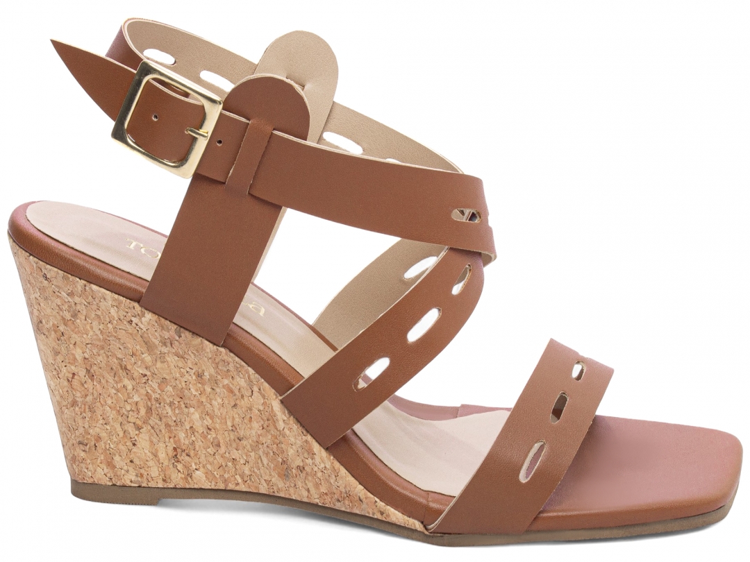 Material: Napa Caramelo; Enfeite: Fivela de Ajuste na cor Dourado; Palmilha: 4 mm de Espessura, Espuma em EVA, Revestida em Napa Caramelo e Taloneira Napa Bege; Plataforma: Traseiro/Salto com 7 cm de Altura, Revestido em Cortiça; Solado de PVC na cor Bege.