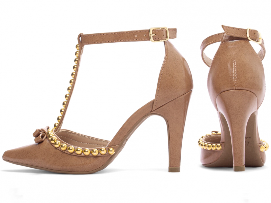 Material: Napa Caramelo; Palmilha: 8 mm de Espessura, Espuma em EVA, Revestida em Napa Caramelo e Taloneira Napa Bege; Enfeite: Fivela de Ajuste na cor Dourado e Apliques de Pérola em ABS na cor Dourado; Salto: 9 cm de Altura Revestido em Napa Caramelo; Solado de PVC na cor Bege.