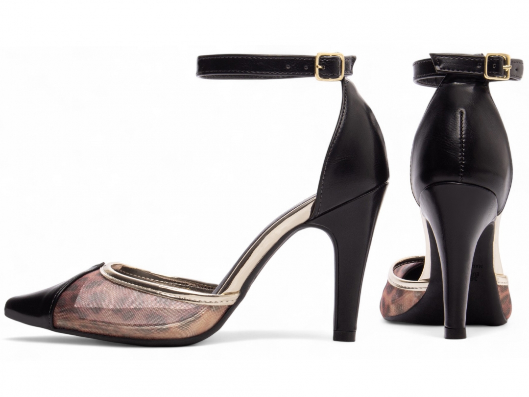 Material: Napa Preto / Metalizado Speechio Ouro Light / Tela Onça; Palmilha: 8 mm de Espessura, Espuma em EVA, Revestida em Metalizado Speechio Ouro Light e Taloneira Napa Preto; Enfeite: Fivela de Ajuste na cor Dourado; Salto: 9 cm de Altura Revestido em Napa Preto; Solado de TR na cor Preto.