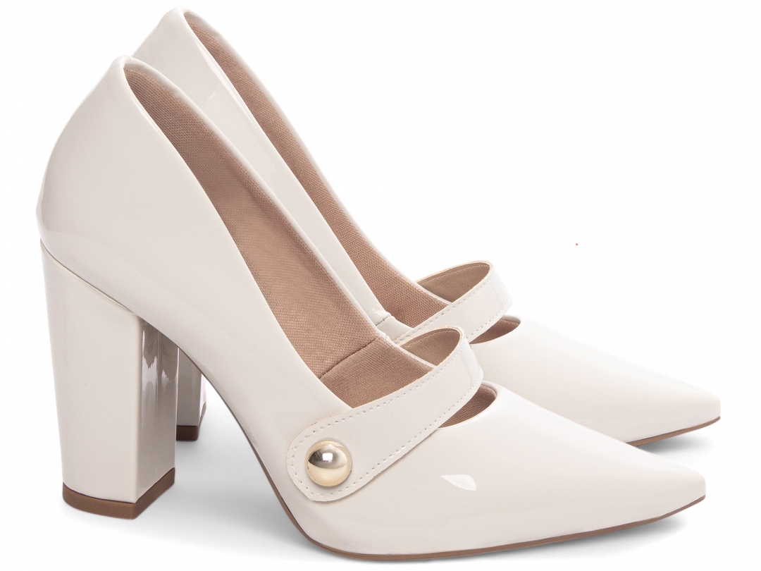 Material: Verniz Off White; Enfeite: Tira com Aplique Lateral na Cor Dourado; Palmilha: com 8 mm de Espessura, Espuma em EVA, e Taloneira Napa Bege; Forro: Cacharrel, material espumado para maior conforto, na cor Bege; Salto: 9 cm de Altura encapado em Verniz Off White; Solado de PVC antiderrapante na cor Bege.