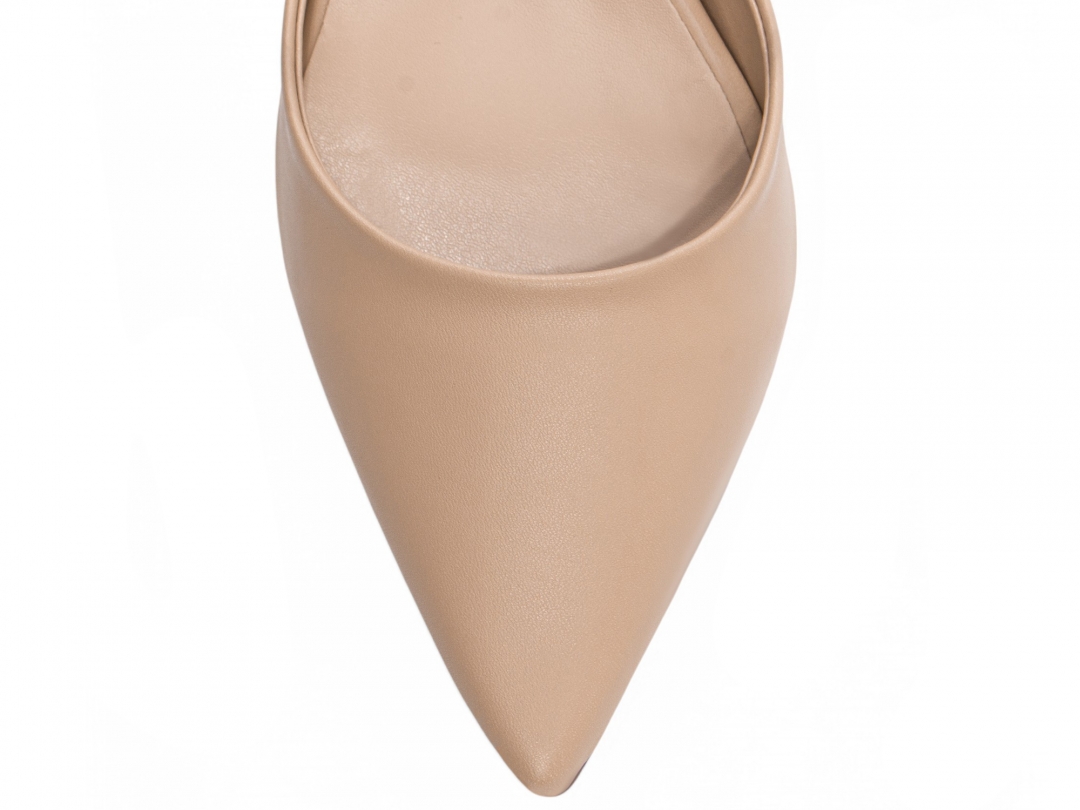 Material: Napa Bege; Enfeite: Peça em ABS para ajuste; Palmilha: 8 mm de Espessura, Espuma em EVA, Revestida em Napa Bege e Taloneira Napa Bege; Forro: Napa Bege; Salto: 6 cm de Altura encapado em Napa Bege; Solado de PVC antiderrapante na cor Bege.