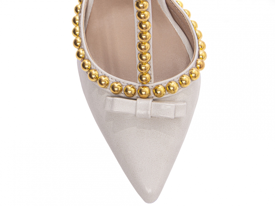 Material: Napa Off White; Palmilha: 8 mm de Espessura, Espuma em EVA, Revestida em Napa Off White e Taloneira Napa Bege; Enfeite: Fivela de Ajuste na cor Dourado e Apliques de Pérola em ABS na cor Dourado; Salto: 9 cm de Altura Revestido em Napa Off White; Solado de PVC na cor Bege.