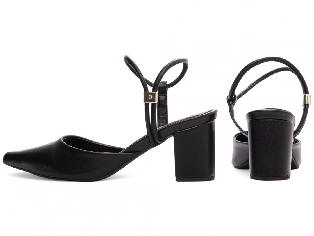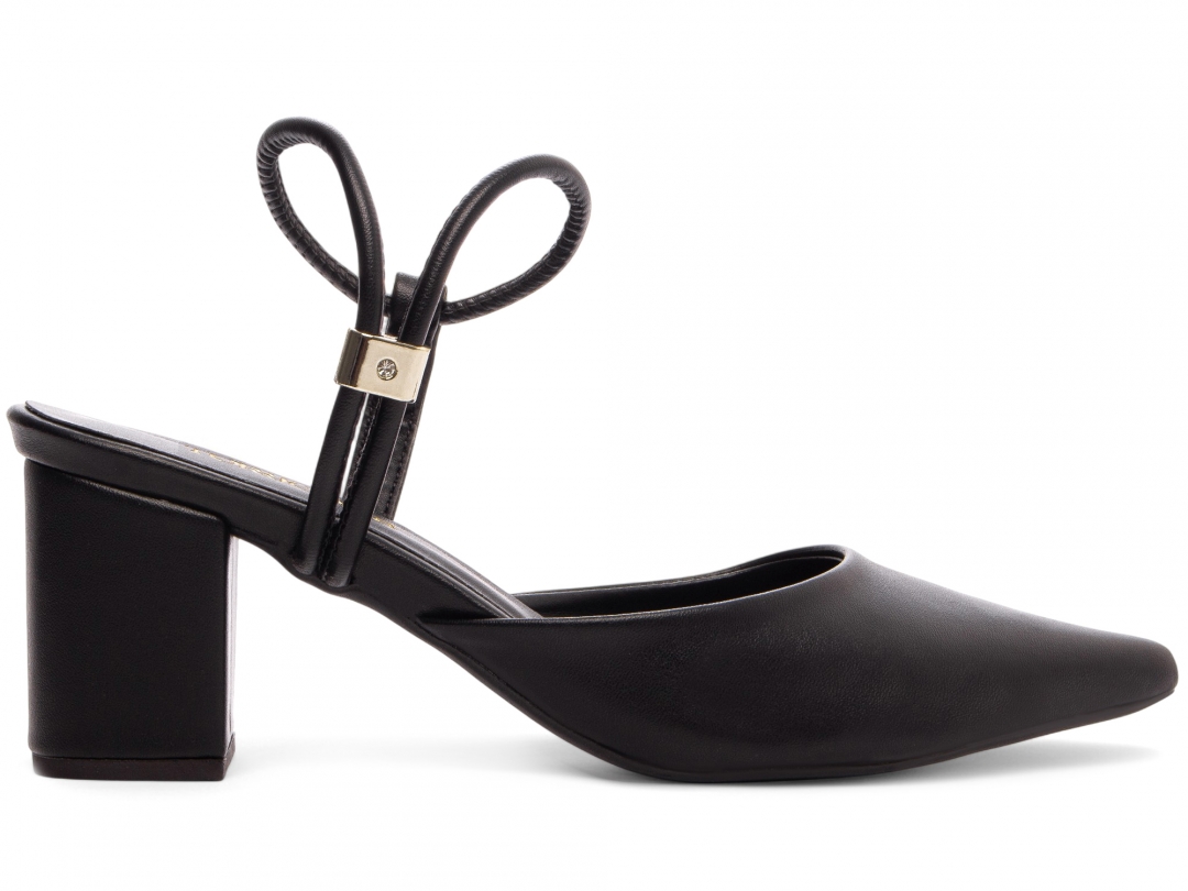 Material: Napa Preto; Enfeite: Peça em ABS para ajuste; Palmilha: 8 mm de Espessura, Espuma em EVA, Revestida em Napa Preto e Taloneira Napa Preto; Forro: Napa Preto; Salto: 6 cm de Altura encapado em Napa Preto; Solado de PVC antiderrapante na cor Preto.