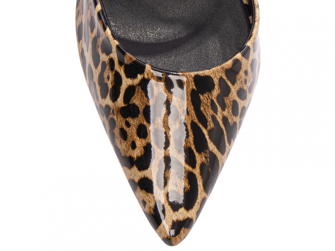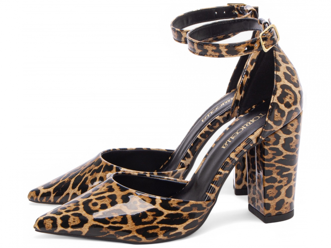 Material: Verniz Onça; Enfeite: Fivela de Ajuste na Cor Dourado; Palmilha: com 8 mm de Espessura, Espuma em EVA, Revestida com Verniz Onça e Taloneira Napa Preto; Forro: Napa na cor Preto; Salto: 9 cm de Altura encapado em Verniz Onça; Solado de PVC antiderrapante na cor Preto.