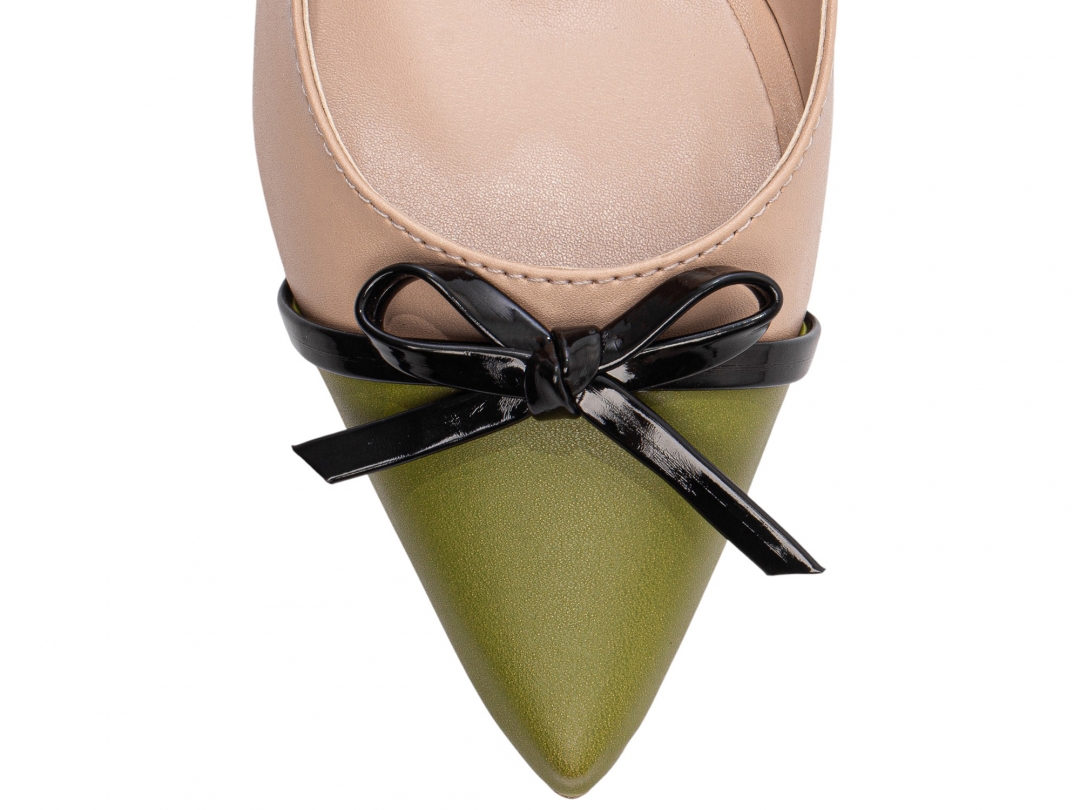 Material: Napa Verde e Napa Bege; Enfeite: Fivela de ajuste na cor Dourado e Laço em Verniz Preto; Forro: Sintético na cor Bege; Palmilha: 8 mm de Espessura, Espuma em EVA, Revestida em Napa Bege e Taloneira Napa Bege; Salto: Fino com 6 cm de Altura Pintado na Cor Bege; Solado de PVC com antiderrapante na cor Bege.
