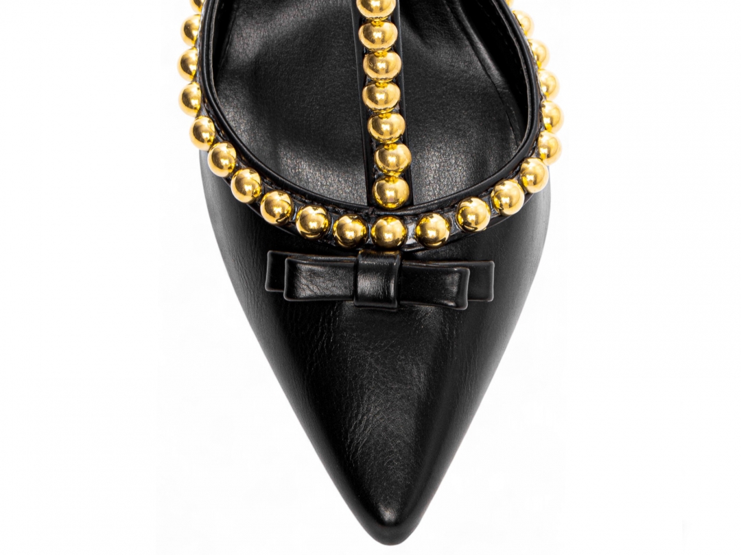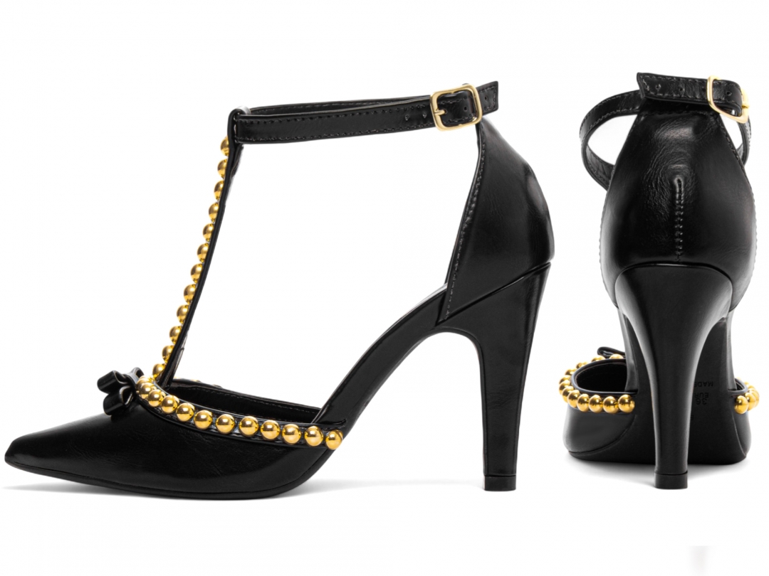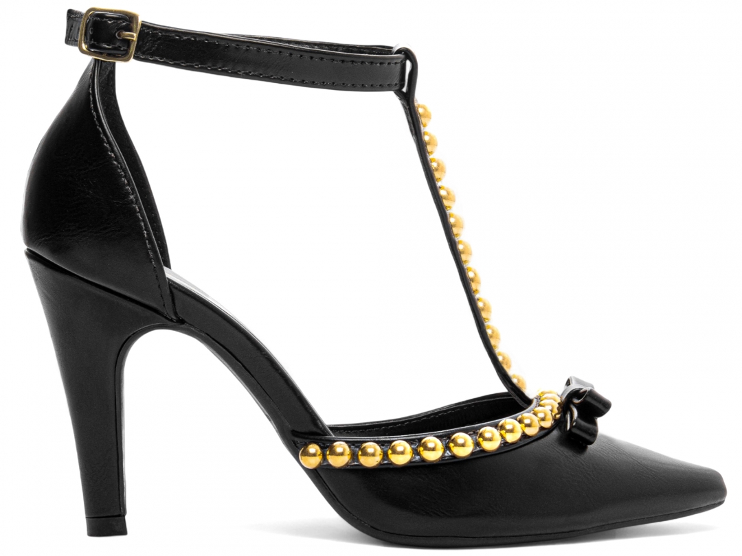Material: Napa Preto; Palmilha: 8 mm de Espessura, Espuma em EVA, Revestida em Napa Preto e Taloneira Napa Preto; Enfeite: Fivela de Ajuste na cor Dourado e Apliques de Pérola em ABS na cor Dourado; Salto: 9 cm de Altura Revestido em Napa Preto; Solado de PVC na cor Preto.